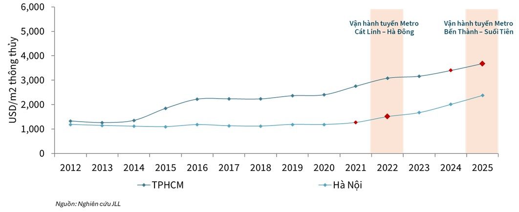 Diễn biến giá căn hộ tại các khu phát triển dọc theo tuyến metro đầu tiên ở TP.HCM và Hà Nội
